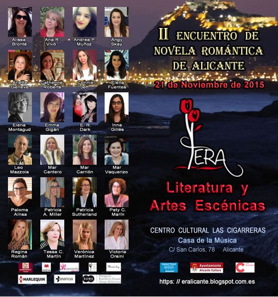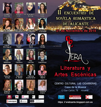 La 2ª edición del Encuentro de Novela Romántica de Alicante organizado por Leo Mazzola se celebró el pasado 21 de noviembre de 2015 en el Auditorio Casa de la Música del Centro Cultural Las Cigarreras. Fue un gran éxito y contó con la participación de 24 autores, una gran parte de ellos alicantinos y el resto procedentes de diversas ciudades de la geografía española como Madrid, Málaga, Almería, Murcia, Albacete y Valencia. |